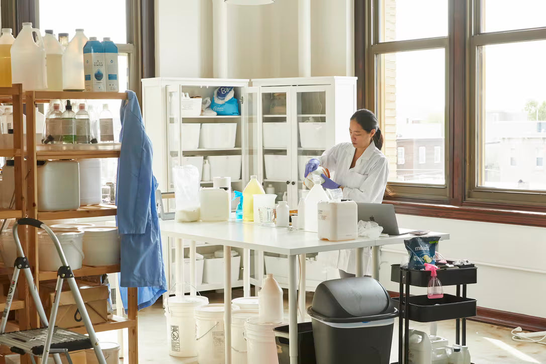 Adeline formulating in the Sabbatical Beauty Lab, 2020.